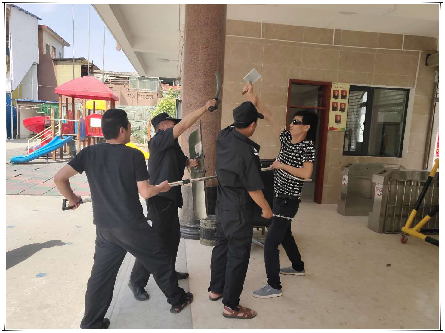 上午10:00,模拟歹徒持刀出现在操场。门卫立即向学校总指挥报告,总指挥宣布立即启动防暴预案,学校安保人员立即拉响警报。防护组立即上前,充分使用防暴工具与暴力分子周旋。各班教师带领幼儿快速撤离到教室,迅速清点人数,稳定学生情绪,迅速关门关窗,用桌椅抵住门。应急组协助将撤离较慢的幼儿护送到就近班级,并及时搜救、保护未来得及撤离的幼儿。最后,其他年轻教师与防护组老师合力将歹徒制服。